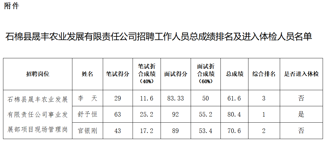 石棉县球盟会官网入口农业发展有限责任公司招聘事业发展部工作人员笔试、面试工作已结束,根据《石棉县球盟会官网入口农业发展有限责任公司招聘工作人员公告》规定,现将总成绩排名及进入体检人员名单予以公告,并将体检有关事宜公告如下。