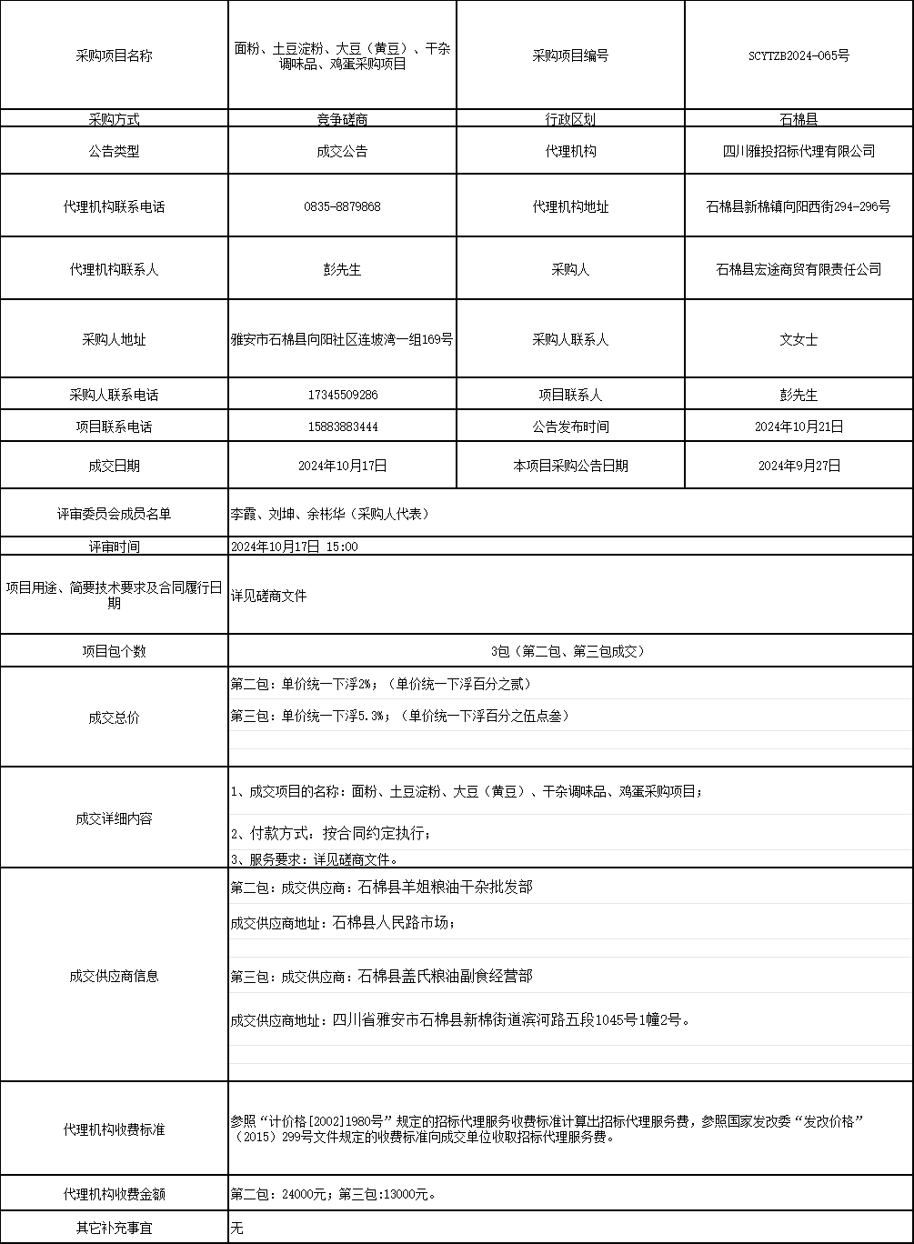 面粉、土豆淀粉、大豆(黄豆)、干杂调味品、鸡蛋采购项目成交结果公告