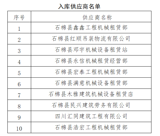 四川誉盛机械租赁有限公司租赁业务供应商入库于2025年4月29日14时00分开、评标。经评审小组评审,确定通过审查入库供应商名单如下: