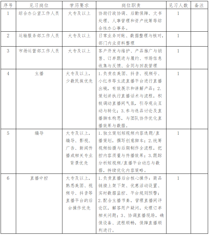 为促进青年就业实践,根据石棉县人力资源和社会保障局关于就业见习工作的相关要求,我公司面向社会公开招聘见习生6名。具体事项公告如下: